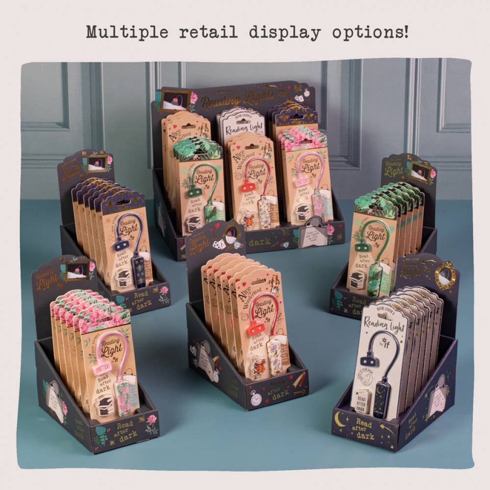Five themed reading lights in beautiful giftable packaging that will stand in a display or hang in a program. Takes 1 x AAA battery in an easy-to-change compartment. Battery included! With adjustable light settings and flexible neck - find your own comfy reading position.