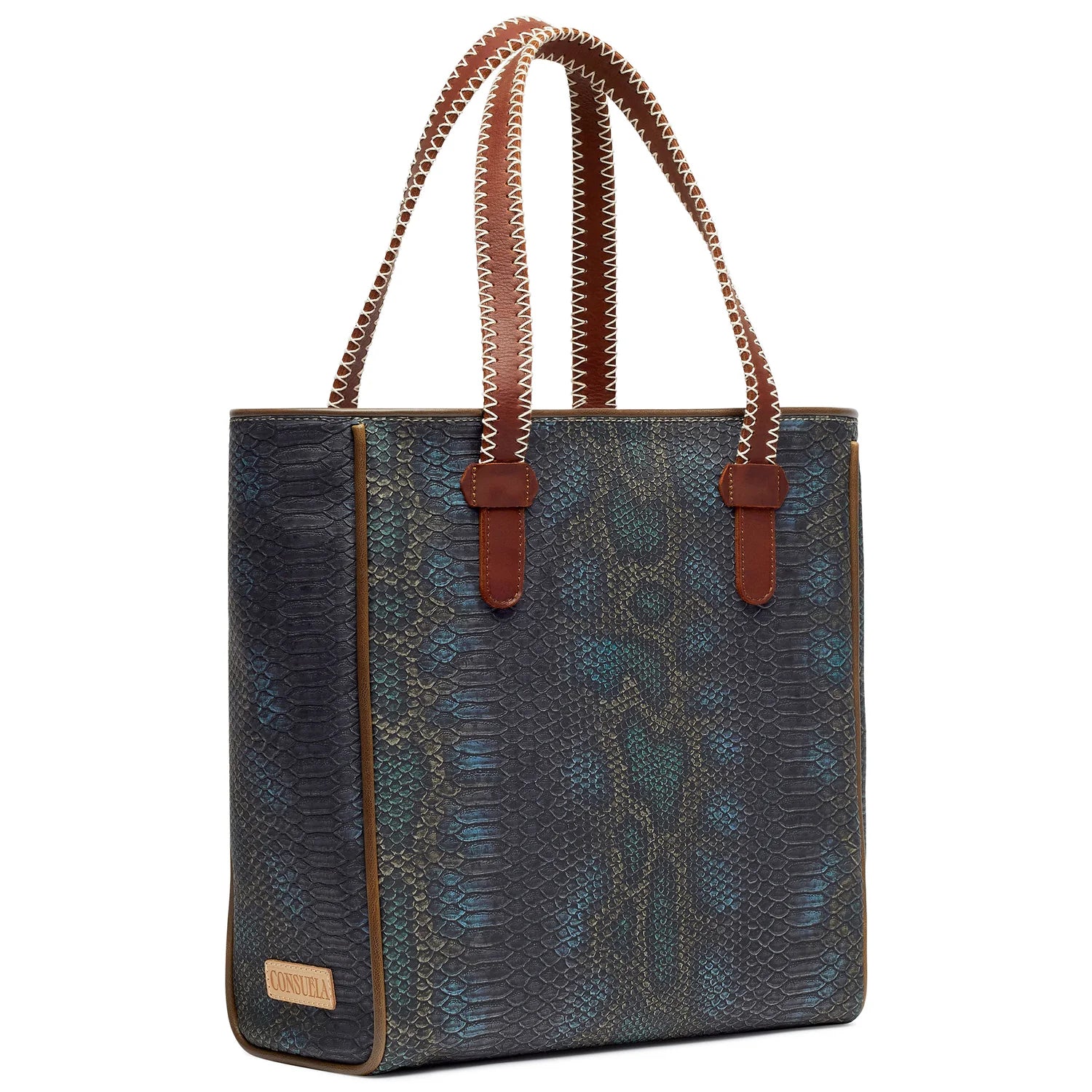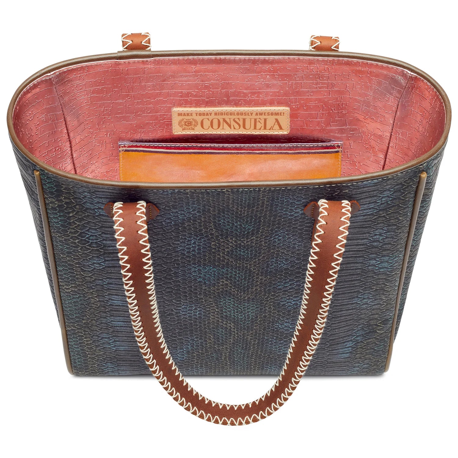 Our Rattler Classic Tote is perfect for life-on-the-go and it packs a statement in Rattler embossed snake print material. Topped with our detailed leather handles, this multi-functional tote is trimmed in leather and crafted to hold its shape. Our tote features a roomy interior and pockets; ideal for carrying your laptop, keys, and phone.