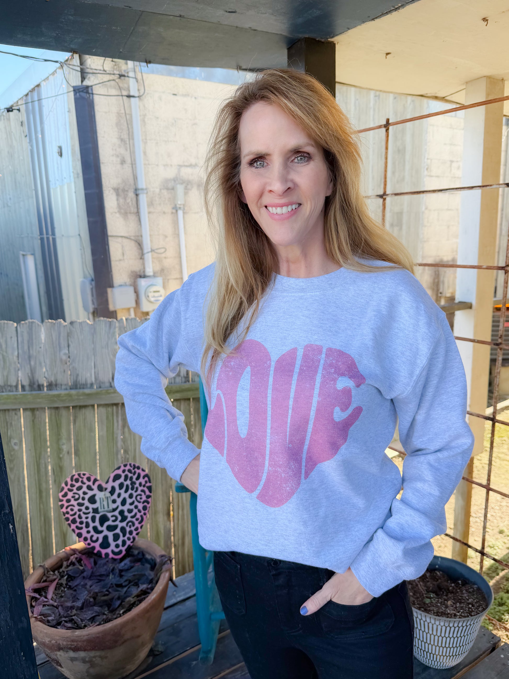 - Pink distressed heart graphic with “LOVE” lettering