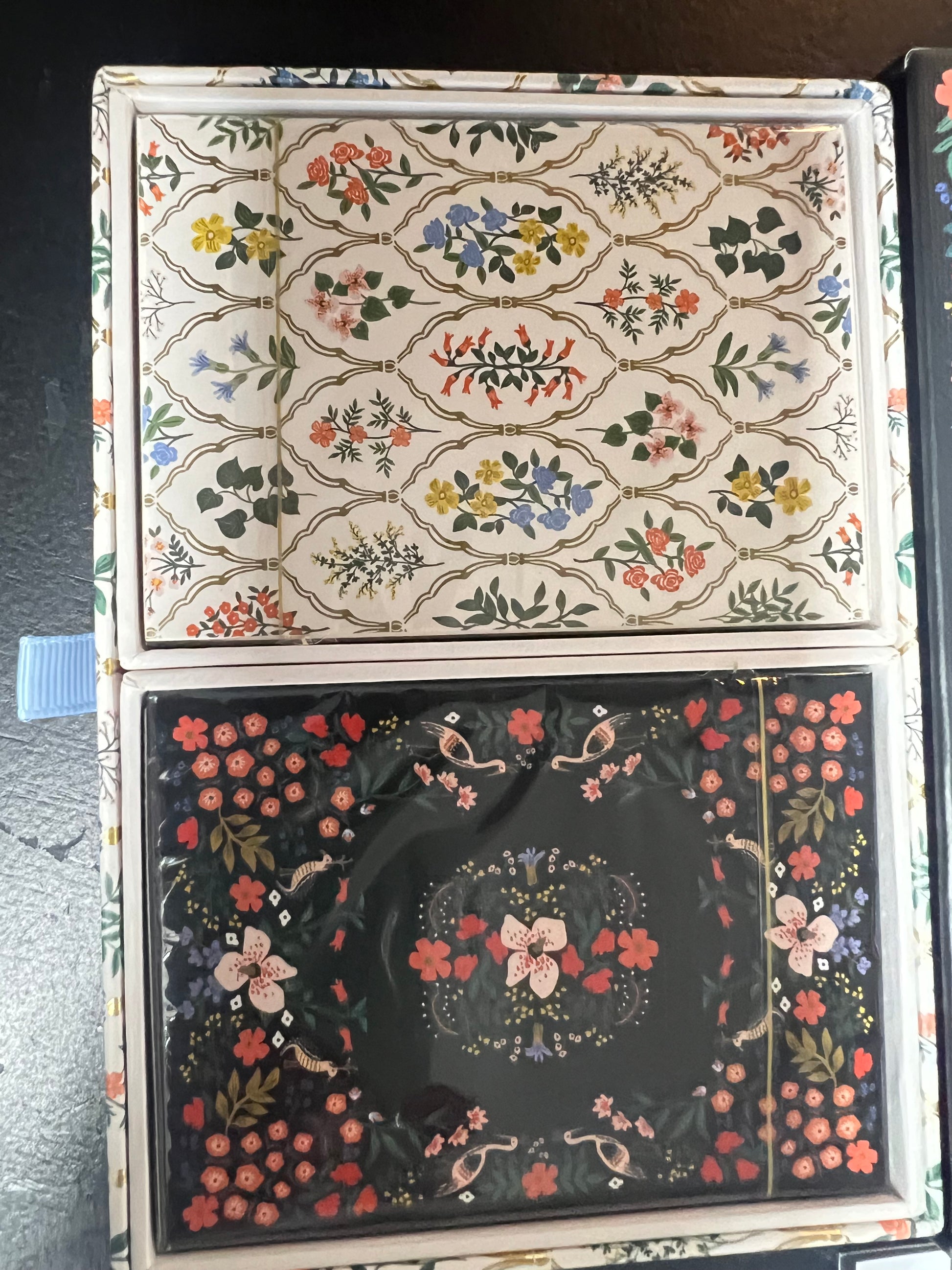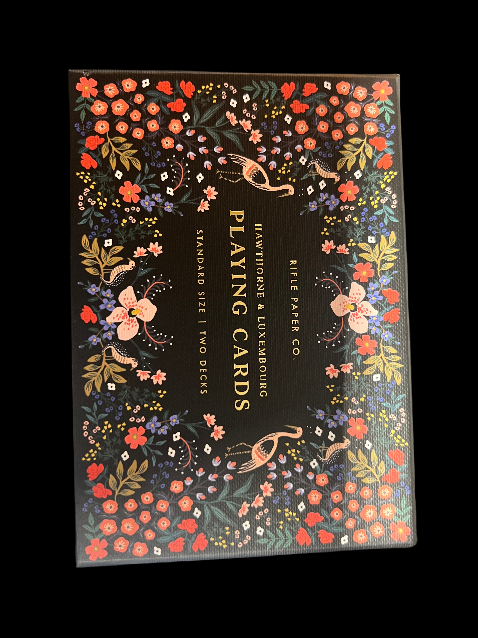 A Set of two standard playing card decks in a decorative keepsake box with gold foil and ribbon pulled tab.