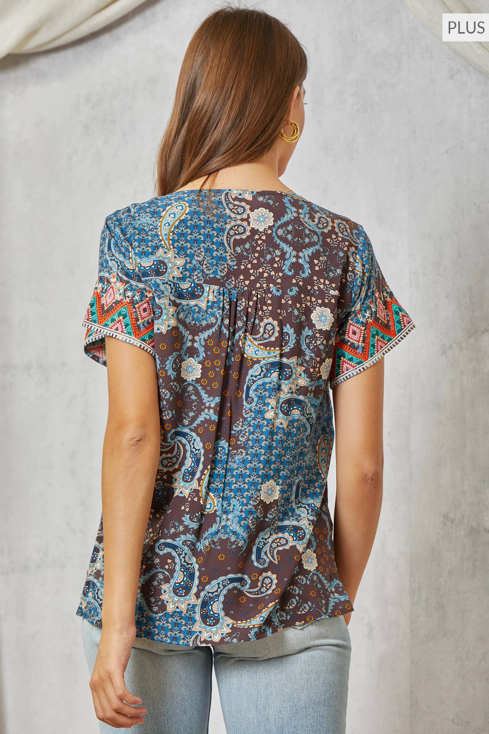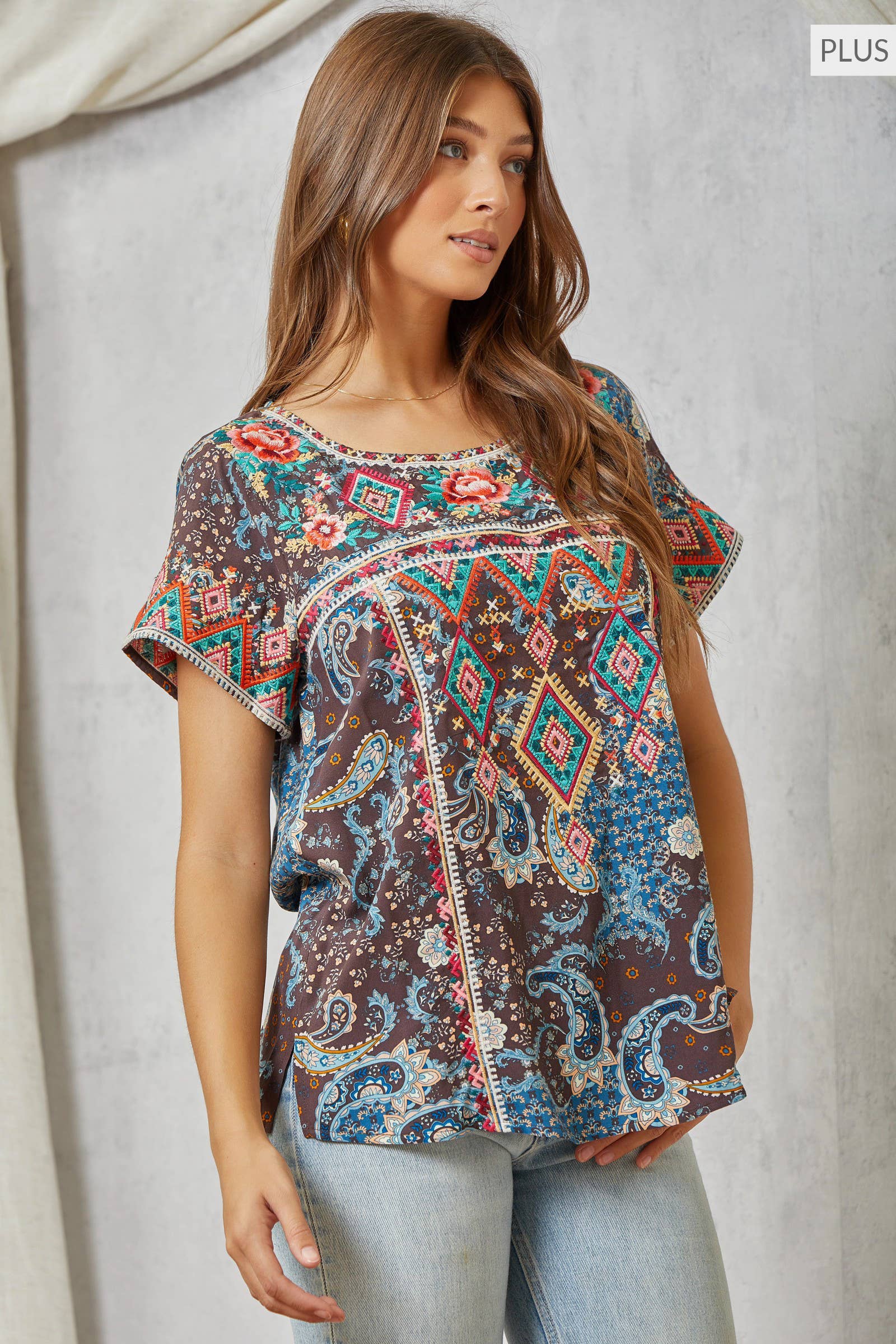 Savannah Jane PLUS SIZE Aztec Embroidery Tunic Top Features a Round Neck