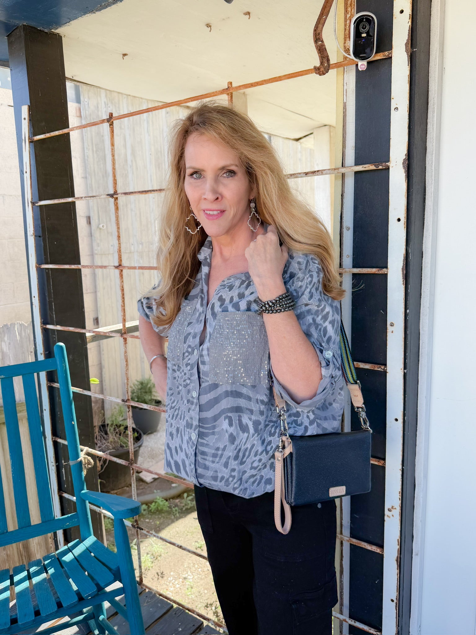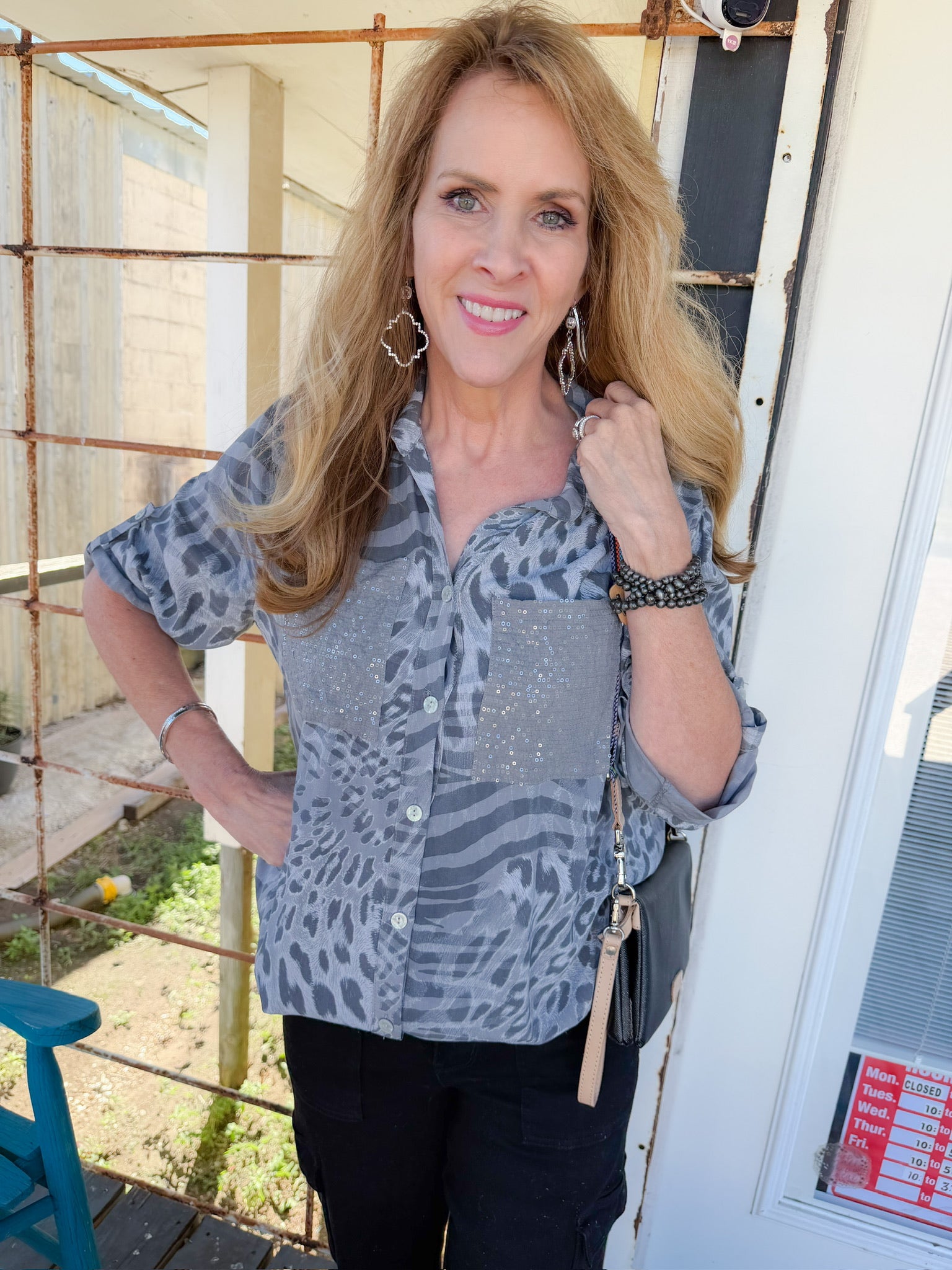 - Gray leopard print top with a touch of shimmer from sequin accents