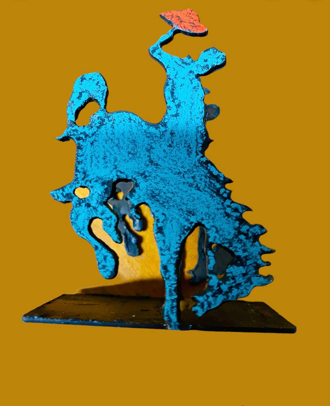 Painted metal Wyoming Bronc business card holder. Also doubles as a holder for sugar packets. These are painted assorted colors on two sides. A truly unique gift guaranteed to bring a smile. Durable metal art piece that can go indoors and outdoors. Made in the USA (Fate, Texas) with recycled metals and painted in assorted colors. Small batch maker.